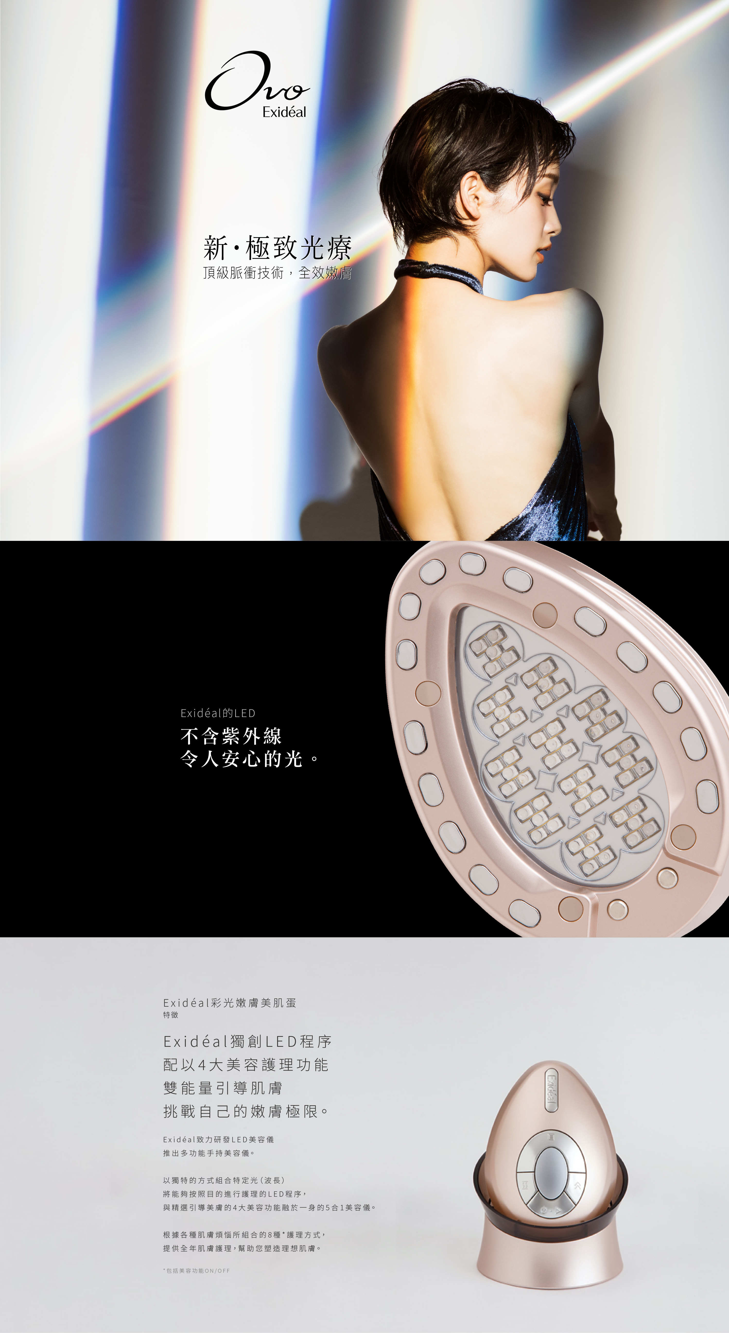 繼Exideal家用彩光美容機(簡稱:大排燈)又一新力作Exidéal ovo 彩光嫩膚美肌蛋,集Exideal 頂端LED脈衝光學技術、RF射頻(radio frequency)、離子導出﹑離子導入、EMS微電流等5大美容院人氣療程的功能,以嶄新而輕巧的設計,一年四季也可常伴左右,緊緻肌膚﹑減少皺紋﹑刺激膠原蛋白增生﹑收細毛孔﹑解決各樣肌膚煩惱。
