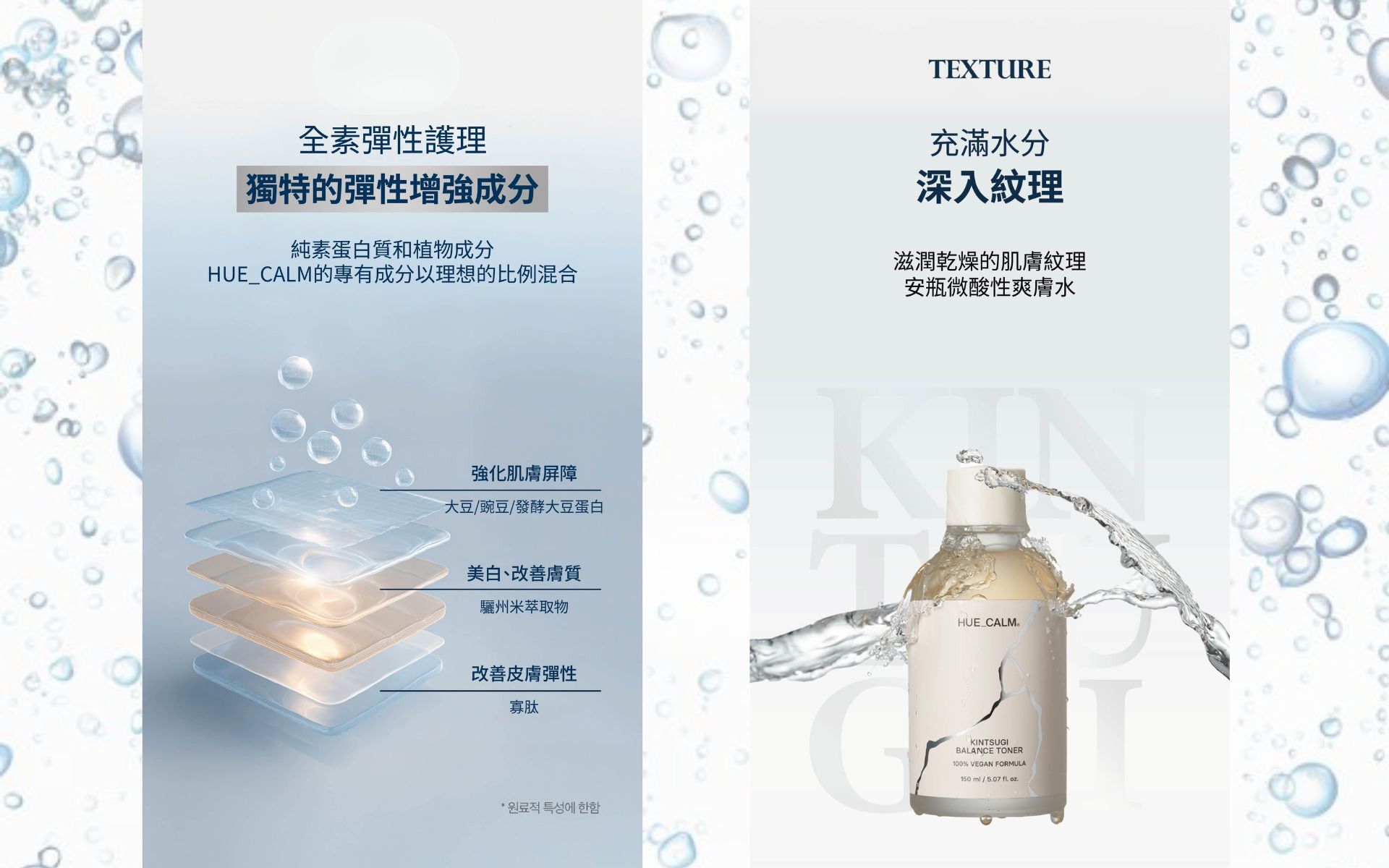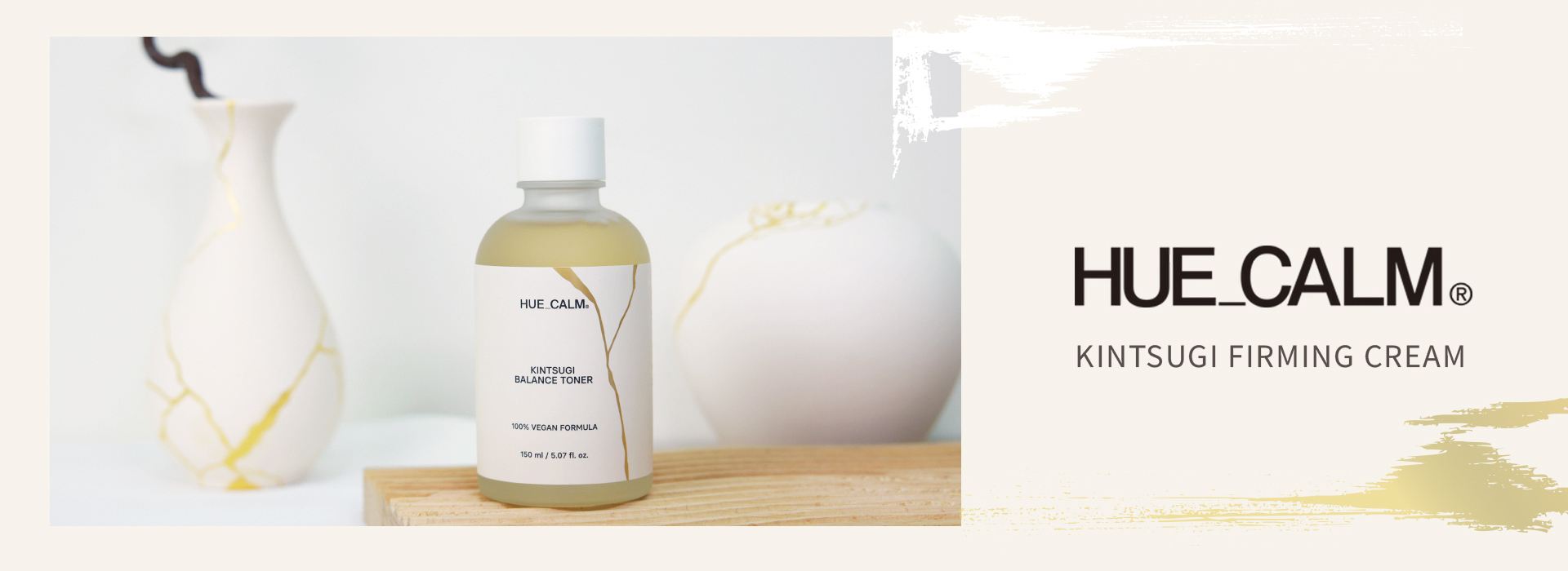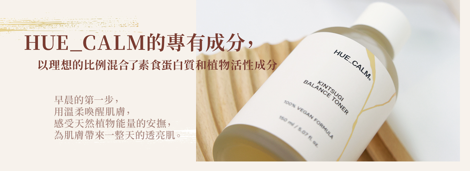 The HUE_CALM Kintsugi Balancing Toner contains vegan protein to help reduce the appearance of wrinkles,