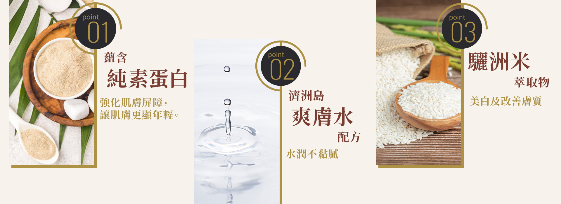 Enriched with plant-based proteins to smooth skin texture; features a soothing Jeju-toner formula that leaves skin hydrated yet never sticky.