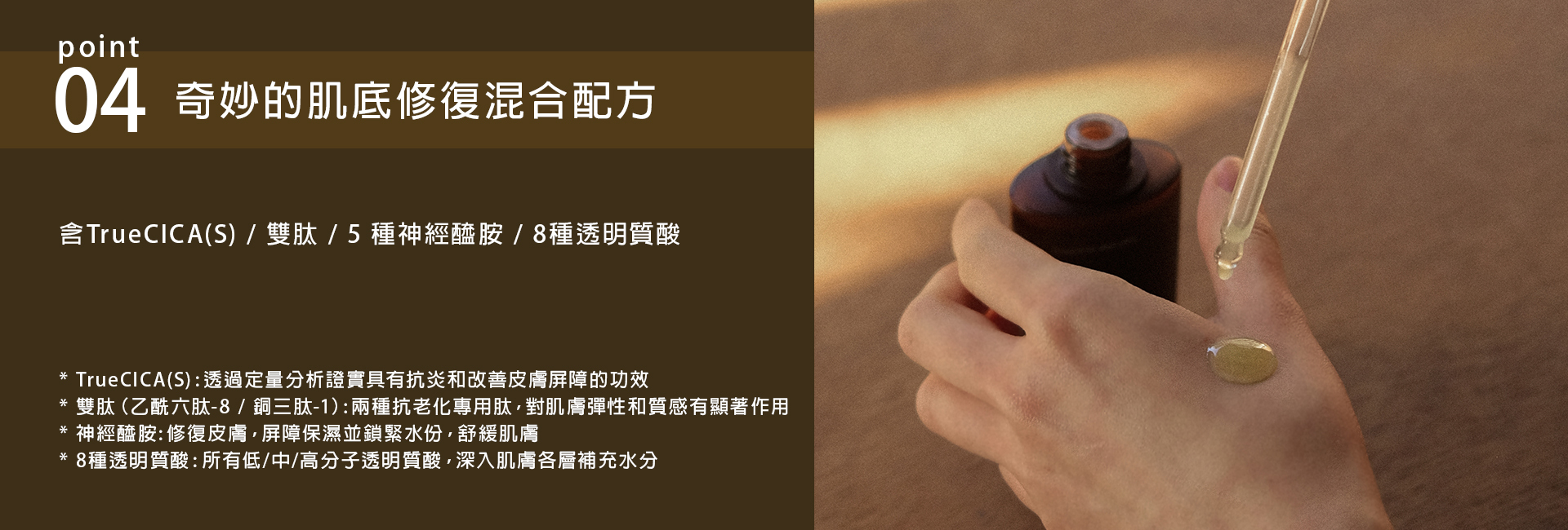 ➃ 5% 8-Type Hyaluronic Acid Complex: Covers a full spectrum of molecular sizes for deep hydration, addressing aging concerns caused by dryness.