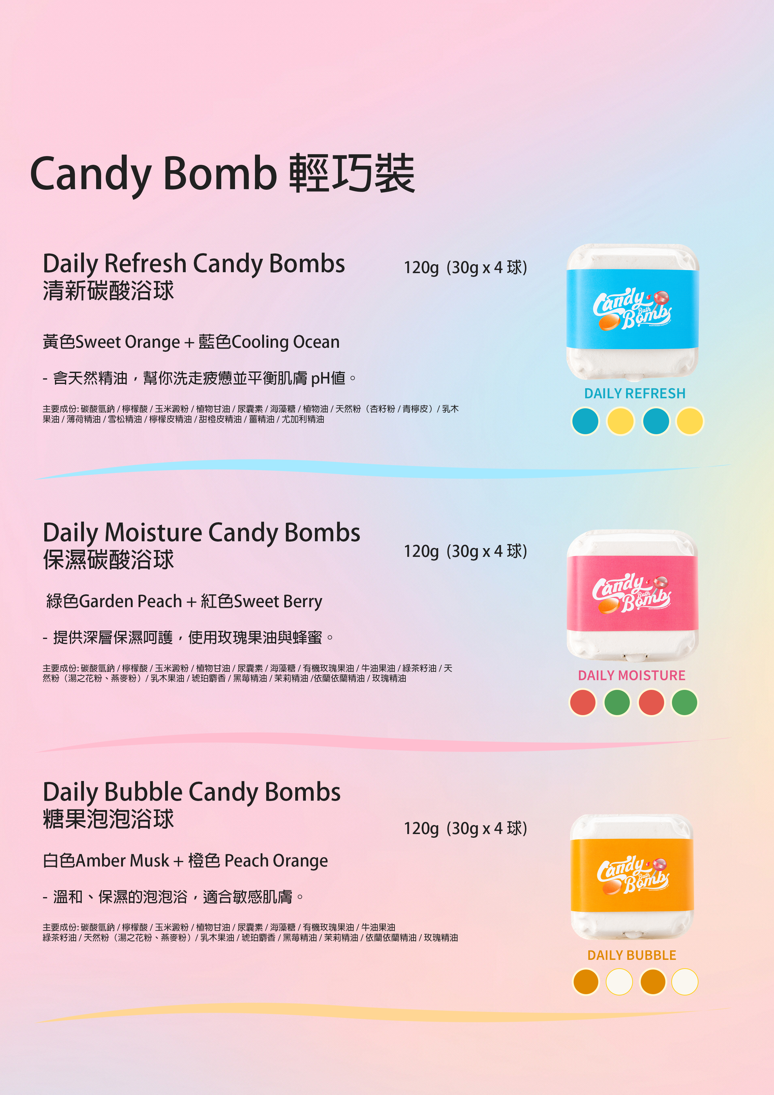 以糖果為靈感設計的圓潤、繽紛浴球,一開包裝就帶來視覺上的療癒快樂。無論是半身浴、全身浴或簡單足浴,都能輕鬆適配不同居家環境。
