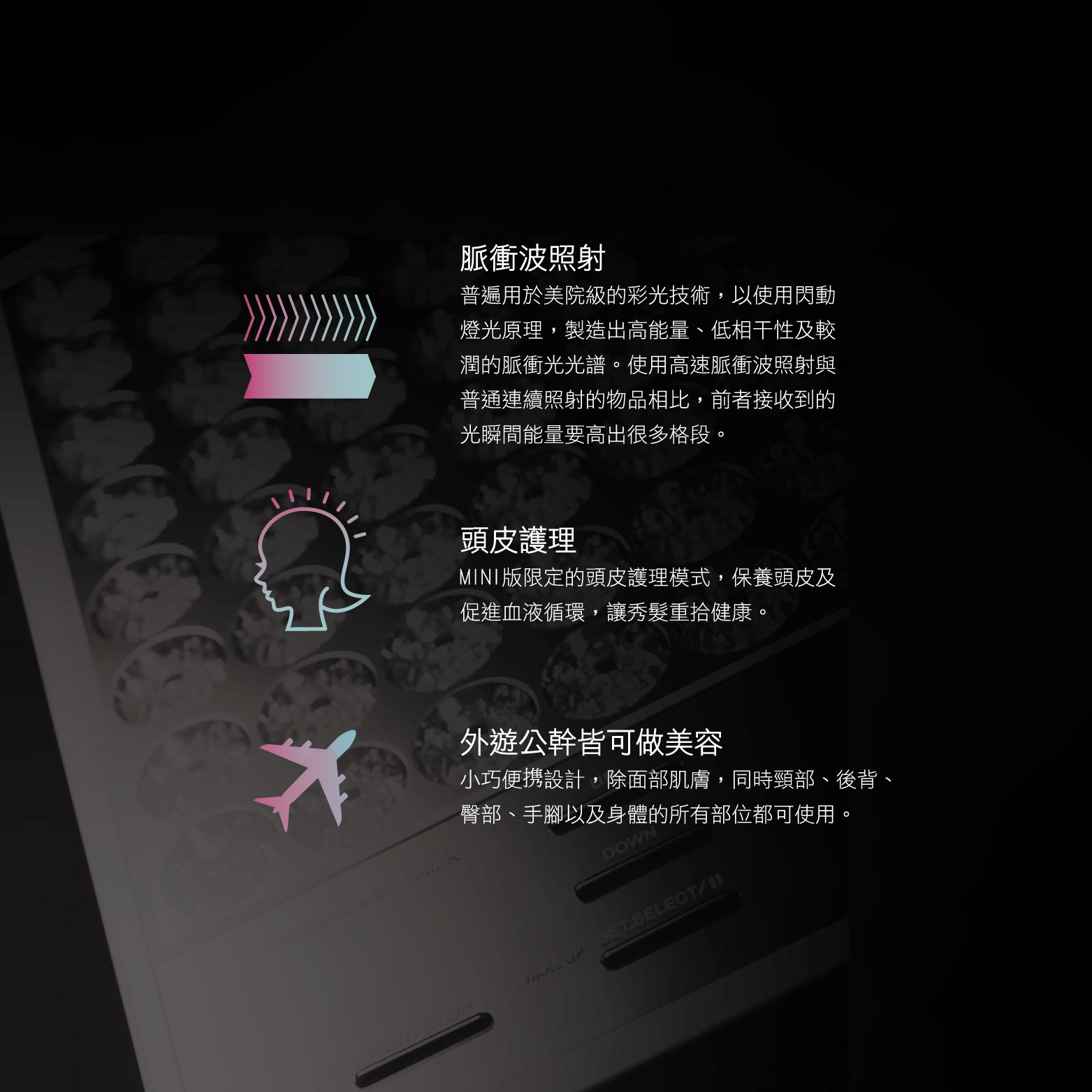 Exideal mini EX-120 擁有高亮度LED﹑獨特高功率照射光學設計﹑脈衝波照射技術﹑將LED推到最高效能,為用家帶來方便、輕鬆、有效的日常護理。EX-120 配備四種LED:藍光,黃光,紅光及紅外線;還專門特製多變化的LED光源程式,融合四種不同LED波長,能有效地穿透至不同皮膚組織,有效緊緻﹑保濕﹑解決痘痘問題﹑及保持頭皮健康的護理。