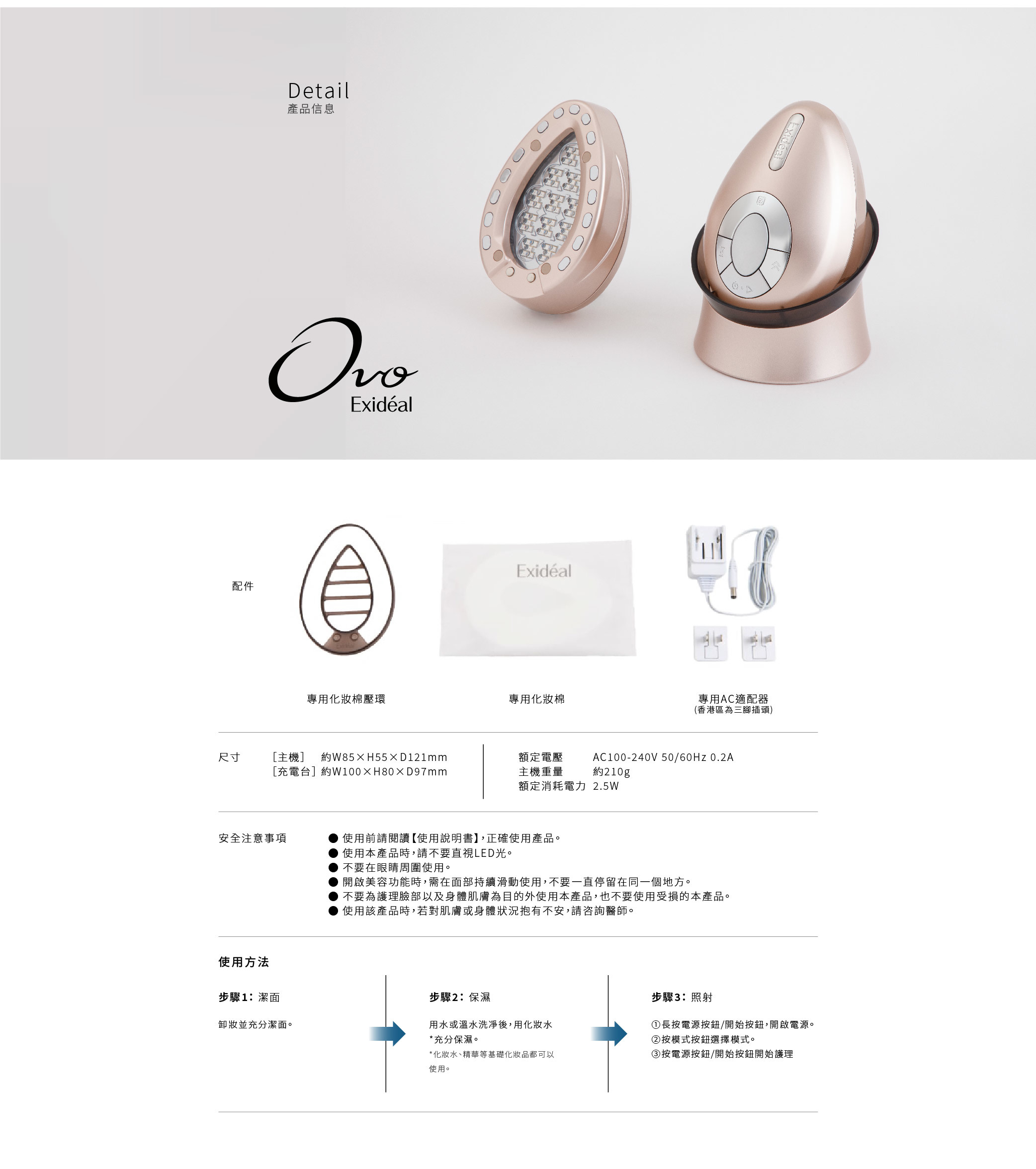繼Exideal家用彩光美容機(簡稱:大排燈)又一新力作Exidéal ovo 彩光嫩膚美肌蛋,集Exideal 頂端LED脈衝光學技術、RF射頻(radio frequency)、離子導出﹑離子導入、EMS微電流等5大美容院人氣療程的功能,以嶄新而輕巧的設計,一年四季也可常伴左右,緊緻肌膚﹑減少皺紋﹑刺激膠原蛋白增生﹑收細毛孔﹑解決各樣肌膚煩惱。