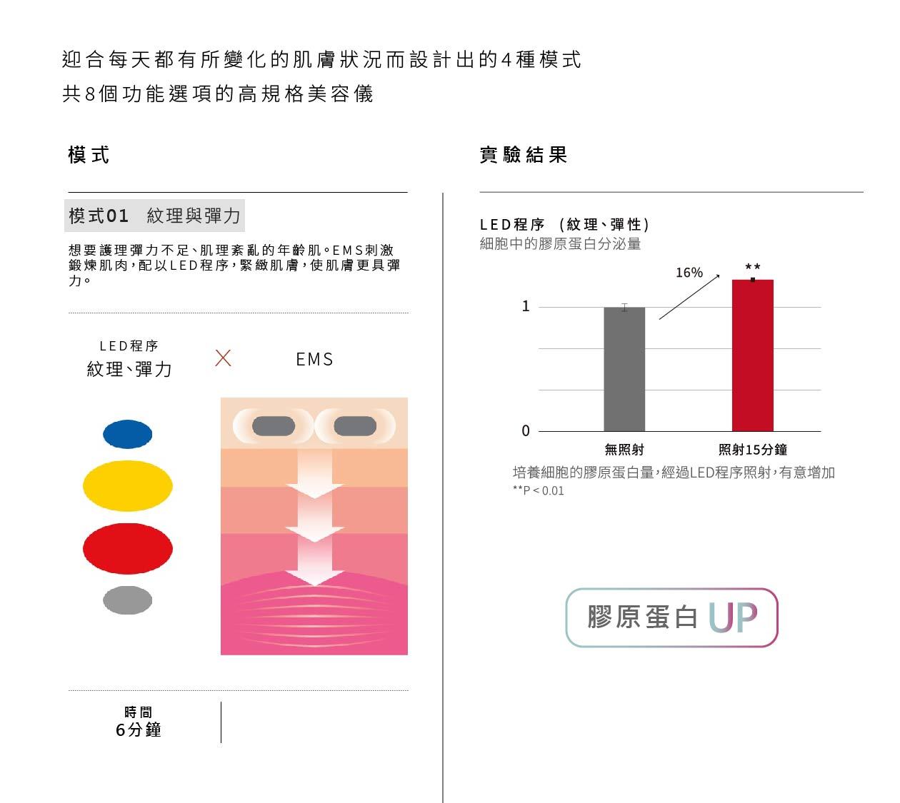 LED有效促進膠原蛋白增生,令肌膚回復彈性緊緻;EMS微電流可到達皮膚筋肉層刺激並鍛鍊肌肉