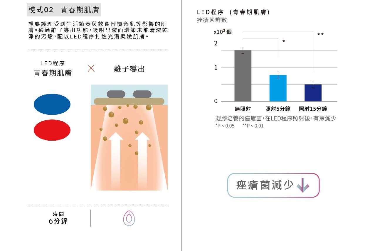 LED有效減少痤瘡菌,消炎殺菌;離子導出可深層清潔毛孔,洗走污垢、油脂、化妝品殘留物及死皮