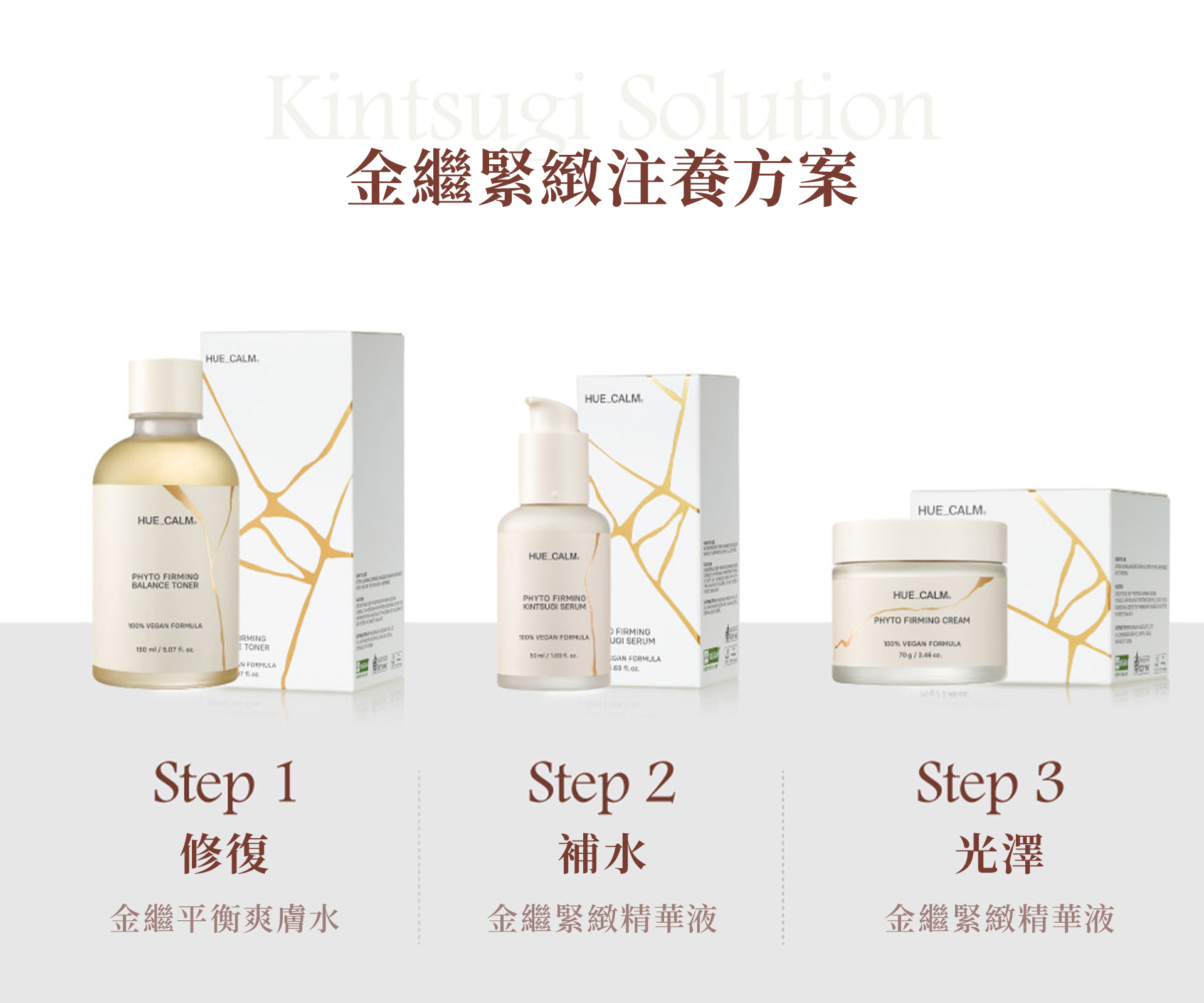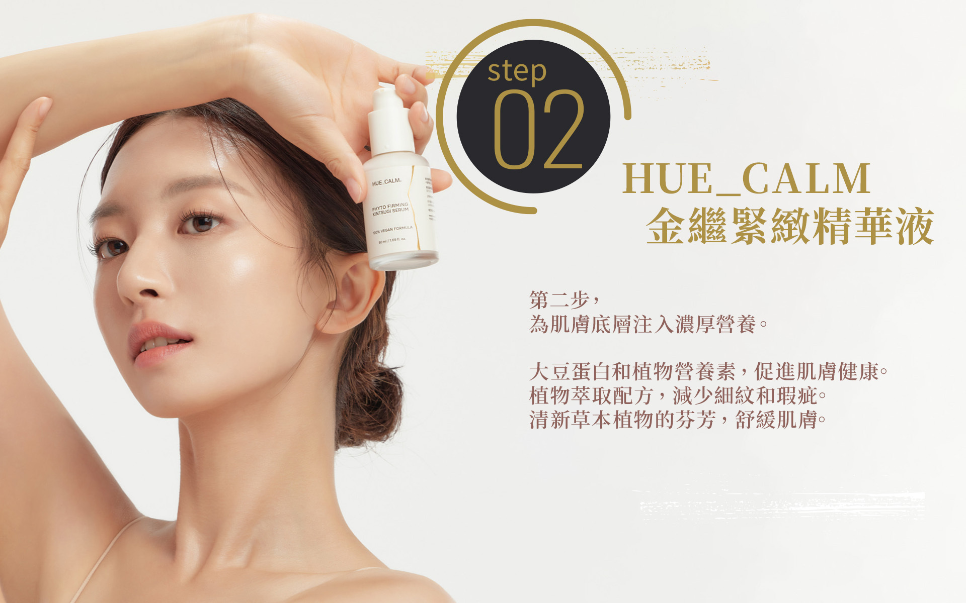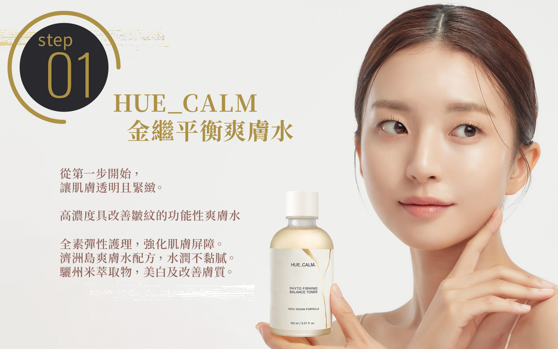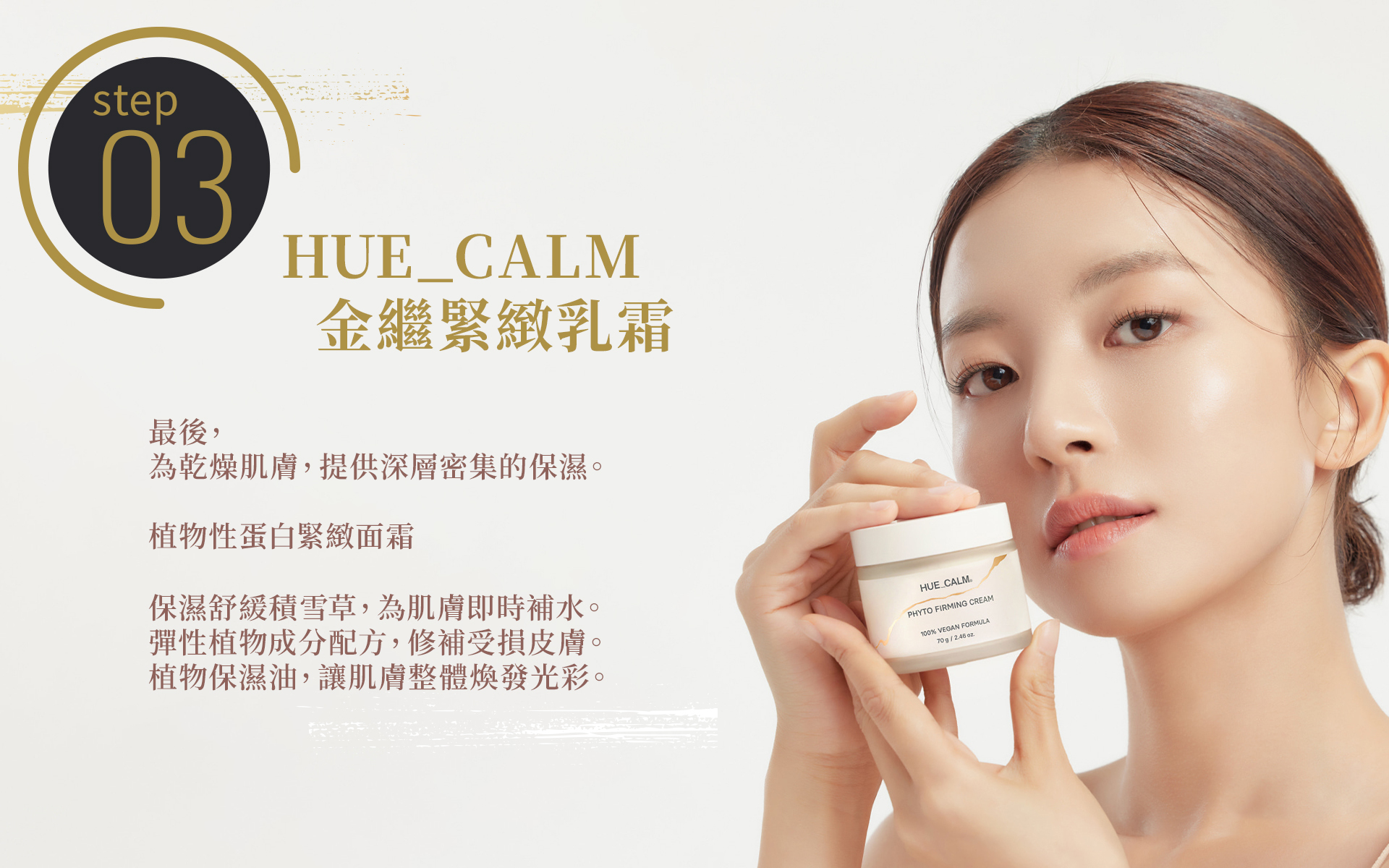 HUE_CALM 金繼平衡爽膚水 → HUE_CALM 金繼緊緻精華液 → HUE_CALM金繼緊緻乳霜