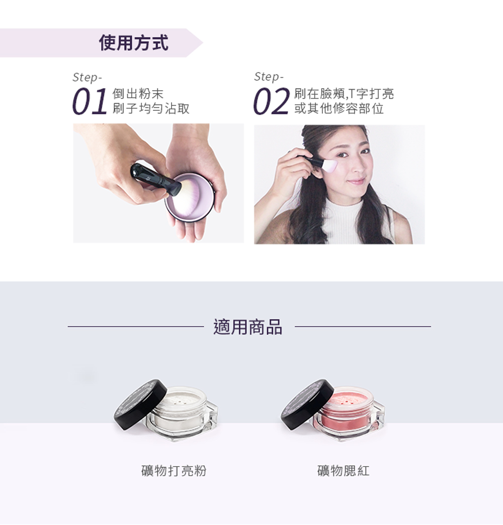 使用方法︰倒出適量粉末讓歌舞伎粉底掃均勻沾取,可先輕輕掃在紙巾上,將過多的粉末掃走,再掃於臉頰、T字位打亮或易出油部位。
