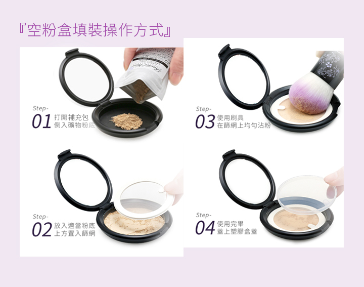 • 可自行填入所需輕透礦物粉底及毛孔隱形飾底粉